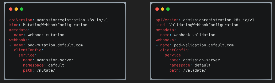 webhook은 쿠버네티스 manifest로 정의합니다. 변조는 MutatingWebhookConfiguration, 검증은 ValidatingWebhookConfiguration을 사용합니다.