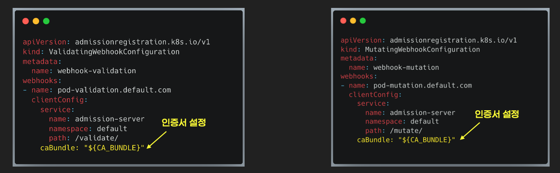 변조wehbook은 MutatingWebhookConfiguration으로 등록합니다. webhook을 등록하기 위해서 이전에 만들었던 self-signed 인증서, 웹서버 pod의 쿠버네티스 service, 웹서버 API가 필요합니다.