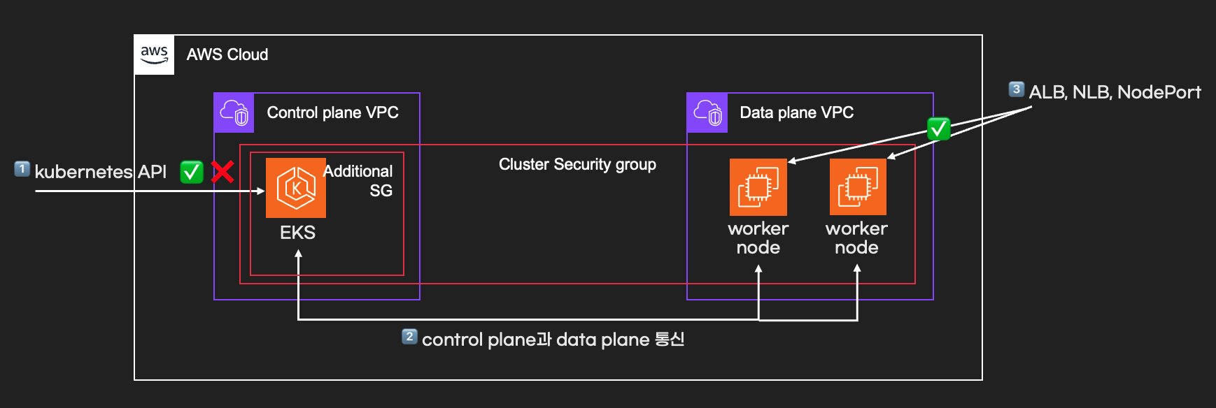 (Additional)cluster security group의 역할은 EKS 엔드포인트 접근을 제한합니다. worker node security group역할은 worker node접근을 제한하는데 node port, ALB, NLB접근을 설정할 때 사용합니다.