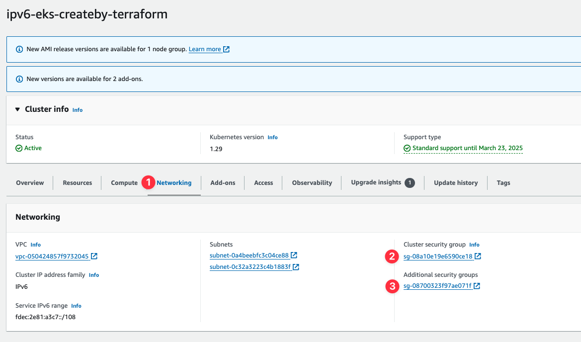 EKS security group은 [EKS 대시보드 -> Networking]탭에서 확인할 수 있습니다.