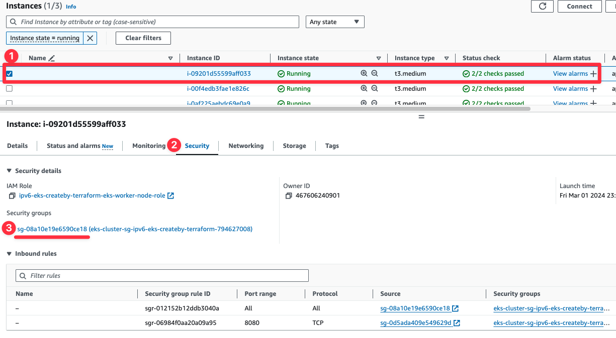 worker node security group은 EC2인스턴스 [security]탭에서 확인할 수 있습니다.