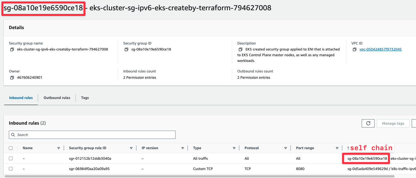 cluster security group규칙을 보면 self chain설정이 되어 있습니다.