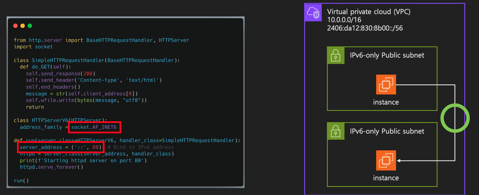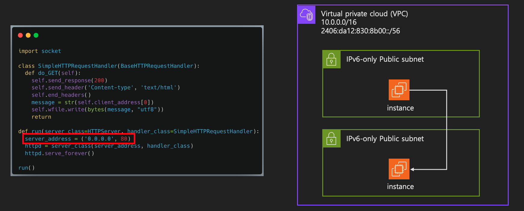 그러므로 IPv6주소로 서버를 호출하면, 서버를 연결할 수 없다는 오류 메세지를 만납니다. 서버는 IPv4소켓을 사용하므로 IPv6 요청을 처리할 수 없기 때문입니다.