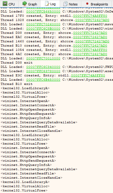 F9를 눌러 실행하고 Log탭으로 이동합니다. 쉘코드가 실행 중에 가져온 API주소를 볼 수 있습니다. 오류가 발생할 때까지 F9를 눌러 실행하여 모든 API이름을 출력합니다.