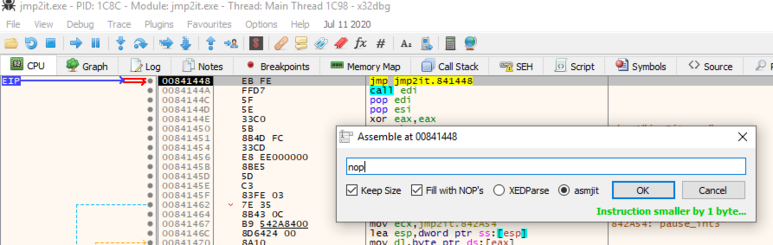 스페이스를 눌러 jmp명령어를 nop으로 변경합니다.