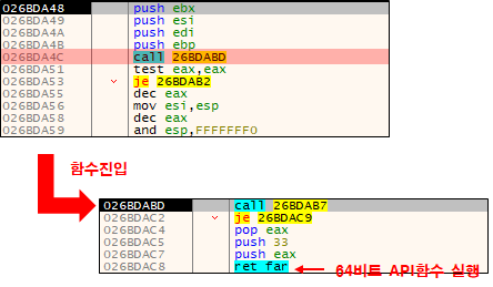 ret far명령어로 64비트 API함수를 실행합니다. ret far을 실행하면 디버거가 꺼집니다.