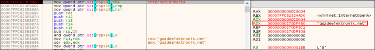 IntetnectConnect함수에 브레이크포인트를 설정하고 실행합니다. InetnectConnectA함수 2번째 인자는 연결대상 정보를 저장합니다. 현재 64비트 프로세스이기 때문에 RDX레지스터가 2번째 인자를 저장합니다.