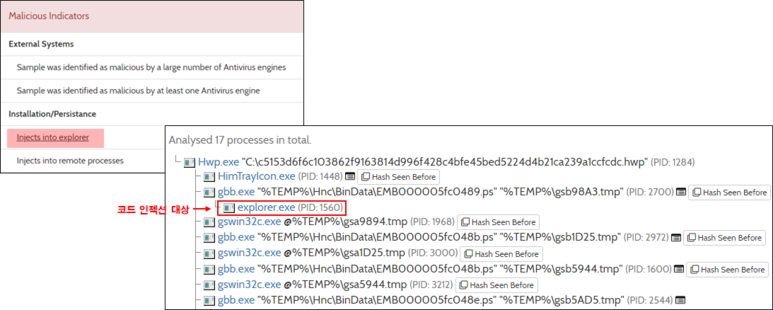 한글문서를 열자마자 바로 악성코드가 실행됩니다. 악성코드의 목적은 explorer.exe를 대상으로 코드 인젝션을 수행합니다.