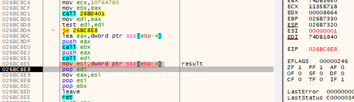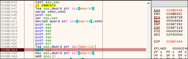 저는 분석환경이 64비트이므로 ESI레지스터가 1로 설정됩니다. F8번을 눌러 한줄한줄 명령어를 실행합니다. call eax를 만나면 F7을 누릅니다.