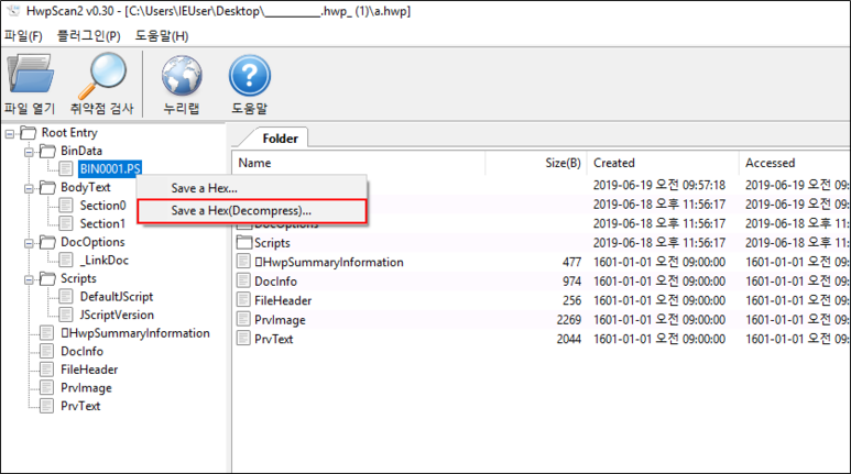 * Root Entry → BinData → BIN0001.ps 오른쪽 마우스를 클릭 후 Save a Hex(Decompress)