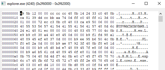 [그림 25]을 스택창을 확인하면 explorer.exe 0x2F60000에 데이터를 쓰려는 것을 알 수 있습니다. Process Hacker의 Memory탭을 확인하면 해당 주소는 현재 비어있고 쓰기(R), 읽기(W), 실행(X) 속성이 있습니다.