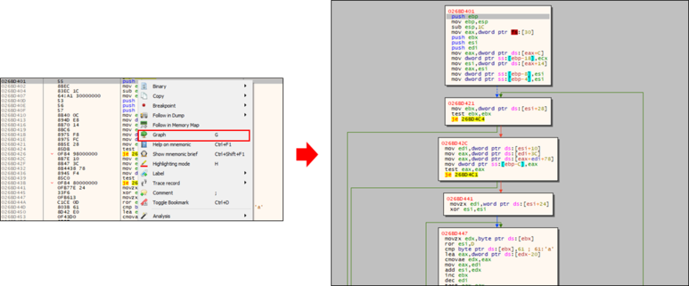 오른쪽 버튼을 눌러 Graph버튼을 클릭합니다. 이제 어셈블리 명령어를 그래프로 볼 수 있습니다.