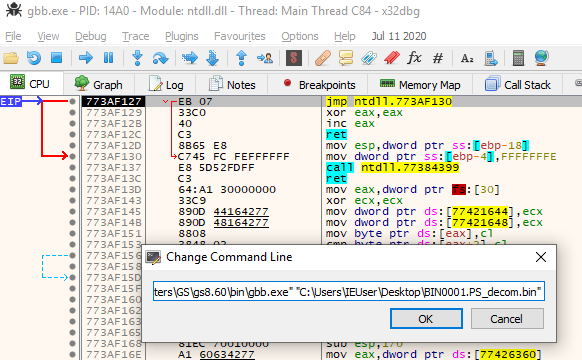 행위분석 [그림 2]를 보면 gbb.exe가 실행되었습니다. gbb.exe는 구버전 한글을 설치하면 기본으로 설치되는 포스트스크립트 실행기입니다. gbb.exe를 디버거로 실행해서 [그림 7]에서 추출한 포스트스크립트를 실행할 것입니다.