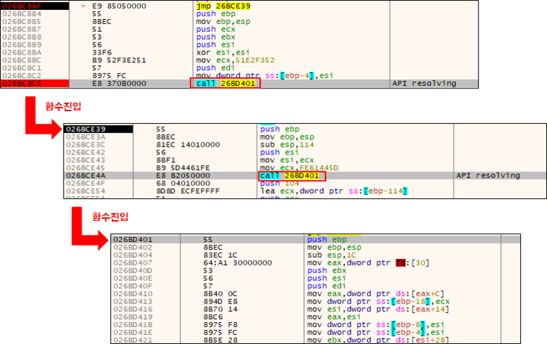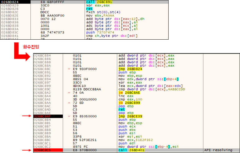 스크롤을 내리면 xor eax, eax 명령어를 볼 수 있습니다. 해당 명령어는 eax를 0으로 초기화하는 명령어입니다. API함수 주소를 성공적으로 가져왔다면 eax값을 0으로 초기화하지 않으므로 오른쪽 구간은 API함수 주소를 가져오는 과정이 실패했을때 실행됩니다. 반대로 왼쪽은 API함수 주소를 성공적으로 가져왔을 때 실행되는 곳입니다.