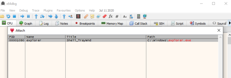 x64dbg를 실행하고 explorer.exe에 Attach(File→Attach)합니다.