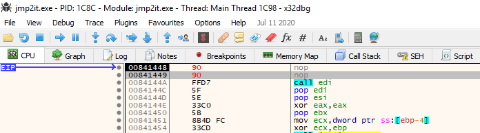 jump2it로 쉘코드를 실행하고 디버거로 jmp2it.exe프로세스에 Attach하는 방식입니다. 번거로운 점은 Attach하고 몇 개의 명령어를 NOP으로 변경해야 합니다.