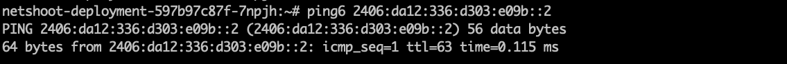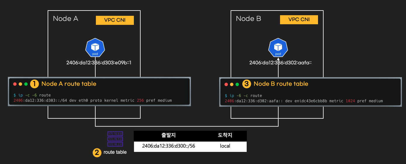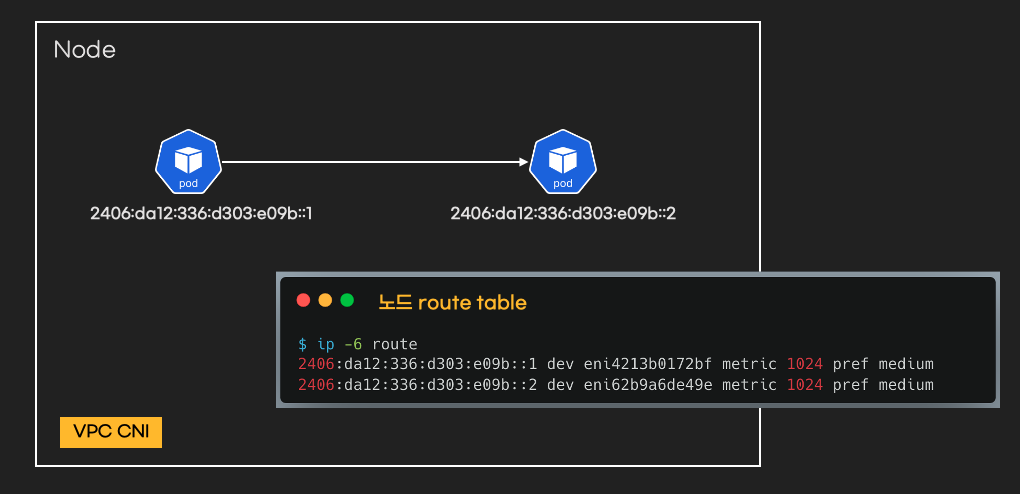 예를 들어 e09b::1 IPv6 IP를 갖는 pod가 e09b::2 pod와 통신할 때, 노드 route table을 참조하여 pod간 통신을 합니다.