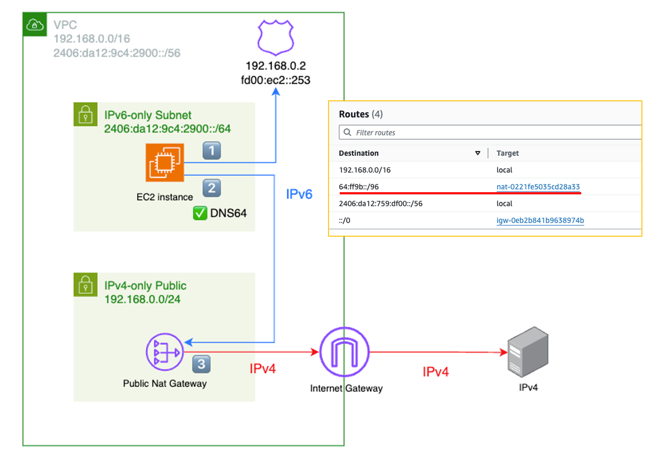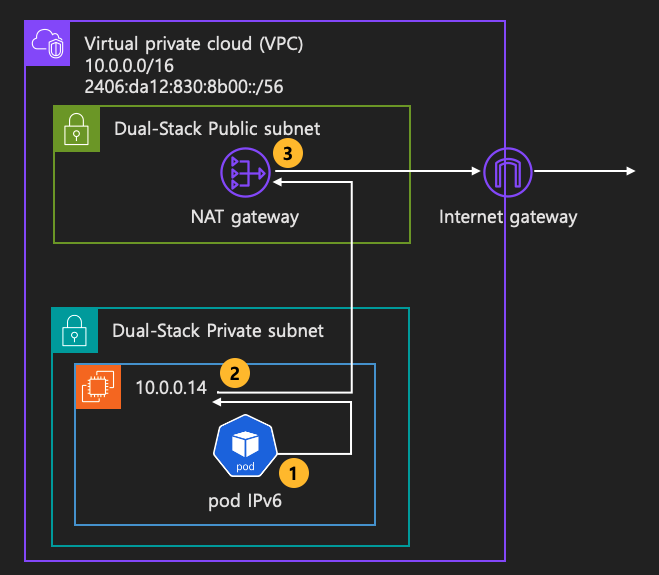 EKS IPv6는 듀얼스택 VPC를 사용합니다. 듀얼 스택 VPC에서 IPv6가 IPv4와 통신하기 위해서는, IPv4 주소 앞에 64:ff9b를 사용해야합니다. 자세한 내용은 이전 글과 유투브를 참고해주세요