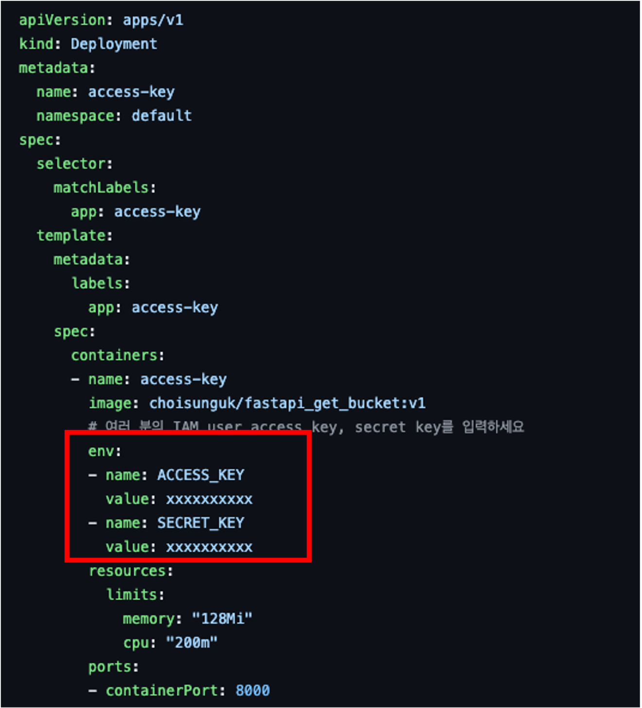쿠버네티스 관리자는 Access key, Secret key를 pod에 설정해야 합니다. 아래 예제는 환경변수를 사용하여 Access key, Secret key를 pod에 주입했습니다.