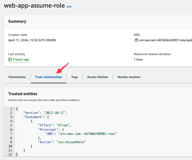 assume role의 TrustRelationShip설정은 EKS node instance profile arn 또는 AWS 계정 accountID를 설정하면 됩니다. 최소권한을 설정하기 위해 EKS node instnace profile arn 설정이 올바른 방법입니다.