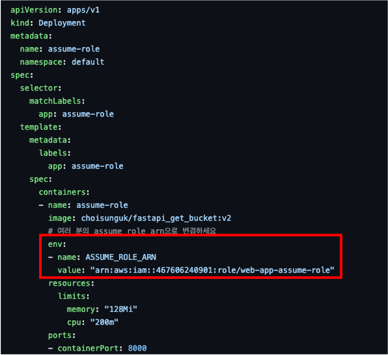 쿠버네티스 관리자는 Assume role arn을 pod에 설정해야 합니다. 아래 예제는 환경변수로 Assume role arn을 pod에 주입했습니다.