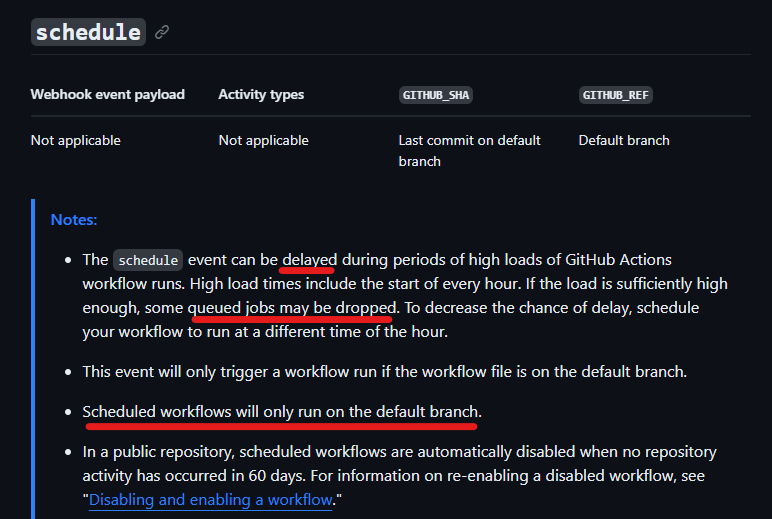 - 디폴트 브랜치(main)에 있는 workflow만 cron을 사용할 수 있다.