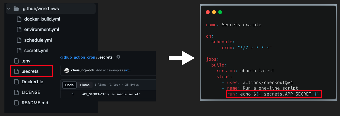 workflow에서 사용하는 시크릿은 “.secrets”파일에 설정합니다.