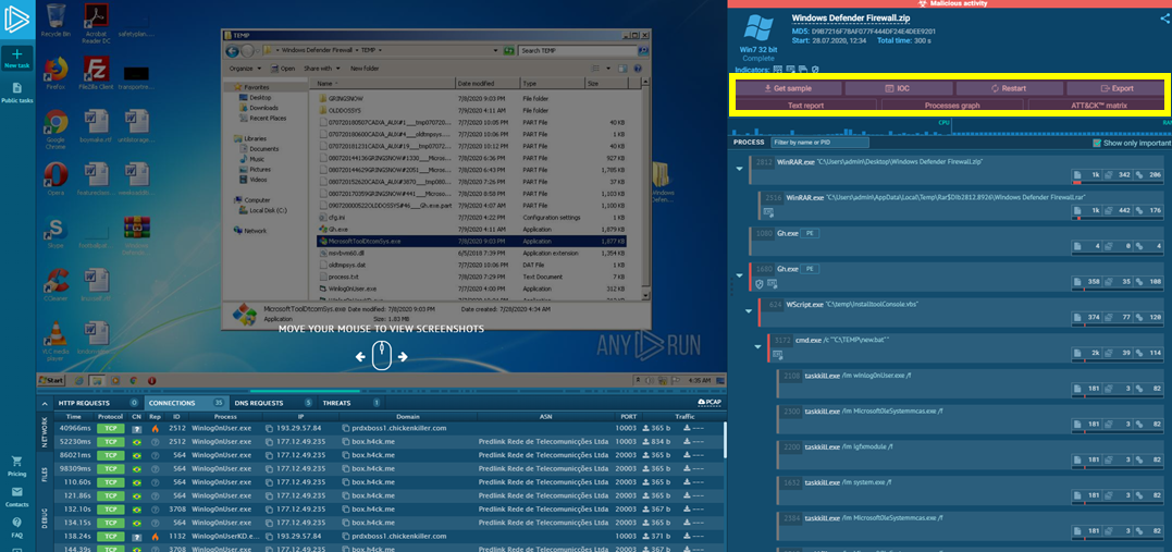요약탭에서는 anyrun샌드박스 환경(예:윈도우 32비트)와 실행한 파일 또는 URL을 표시합니다. 그리고 분석한 악성행위에 대해 태깅과 아이콘을 출력합니다.