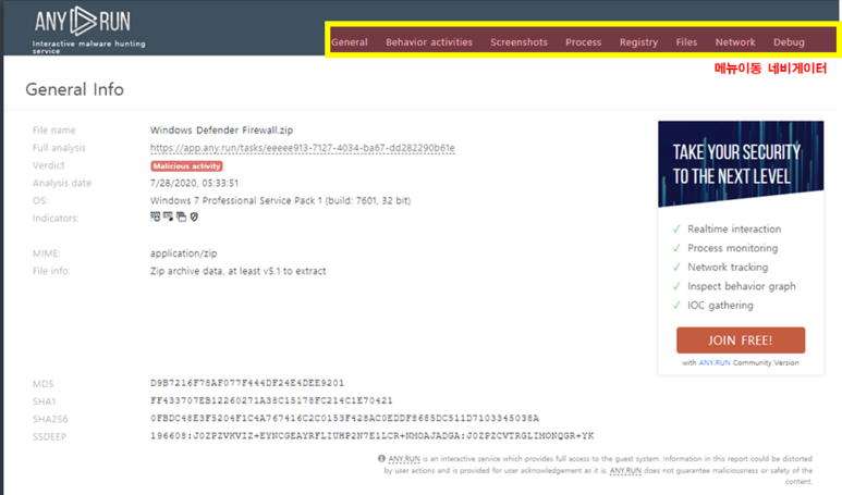 이 탭에서는 무료회원 가입 후 샘플을 다운로드 받을 수 있습니다. 그리고 파일, 프로세스 등 상세 분석 보고서페이지로 이동하는 버튼들이 있습니다.