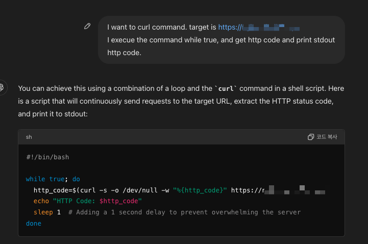 아래 예제는 curl 응답 중 http code를 필터링했습니다. 놀랍게도 부하를 막기 위해 반복문에 sleep도 추가해줬습니다.