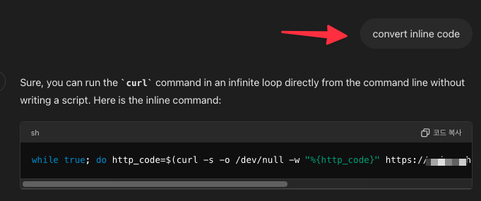 명령어가 너무 길어 한줄로 줄여달라고 chatgpt 4.o에게 부탁했습니다. 명령어 한줄로 줄이고 싶으면 "inline code"키워드를 명시하면 됩니다.