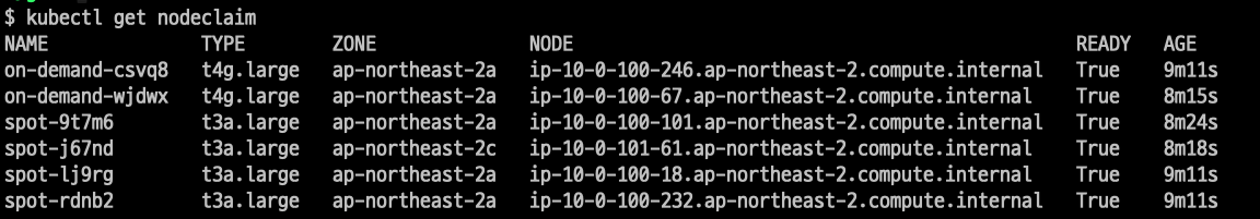 pod가 on-demand:spot인스턴스로 분배 스케쥴링되었는지 확인하려면, kubectl get node로 확인하면 됩니다. capacity-type node label으로 인스턴스 타입을 확인하면 됩니다.