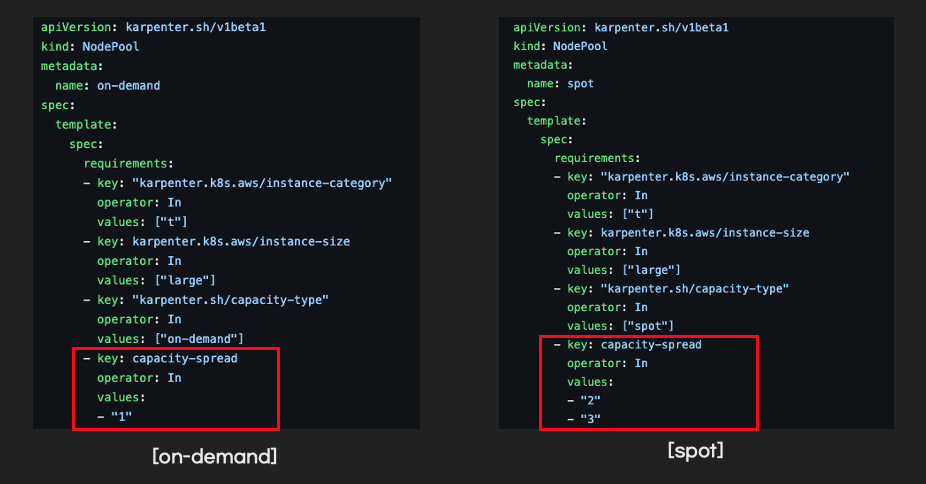 EKS 노드 운영 비용을 줄이기 위해 on-demand인스턴스와 spot인스턴스를 분배합니다. karpenter 또한 새로 생성한 노드에 대해 on-demand, spot인스턴스 비율을 정할 수 있습니다.