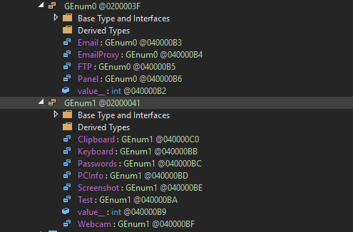 GEnum0, GEnum1열거체를 확인하면 클립보드, 키보드, 패스워드, PC정보, 스크린샷, 웹캠, 이메일, FTP정보를 탈취기능이 있다는 것을 추측할 수 있습니다.