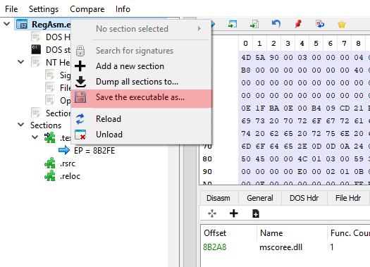 NtResumeThread에 브레이크포인트를 설정하고 실행하면 0x00400000주소에 쓴 최종 데이터를 확인할 수 있습니다. 데이터를 파일로 추출하고 PE포맷을 복원합니다.