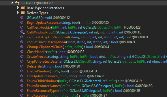 GClass33클래스에는 키로거, 클립보드 탈취, 프로세스 생성 등 악성행위와 관련된 API함수 목록이 있습니다.