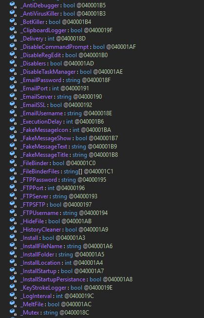 GClass35클래스에는 안티 디버깅, FTP정보 탈취, 이메일 정보 탈취, 봇기능, 파일설치 등과 관련된 필드 목록이 있습니다.