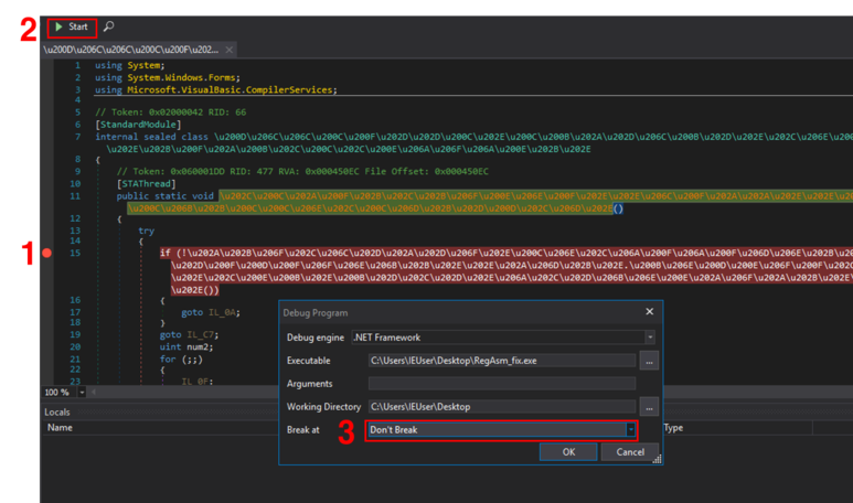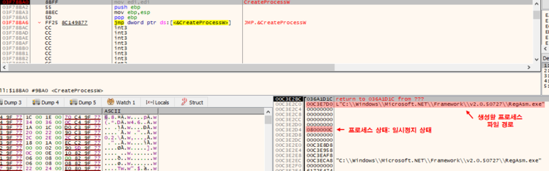 스택창을 확인하면 Regasm.exe를 일시정지상태로 실행하려고 합니다. [그림 1], [그림 11]에서 분석했던 내용입니다.