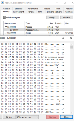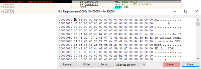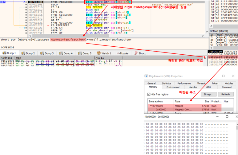 자식 프로세스에 공유 메모리를 인젝션하기 위해 ZwMapViewOfsection을 사용합니다. tobt트레이싱을 통해 ZwMapViewOfSection함수를 호출한 곳으로 이동합니다. 그리고 함수를 실행하면 자식 프로세스 RegAsm.exe의 0x00400000주소에 공유 메모리가 인젝션된 것을 확인 할 수 있습니다.