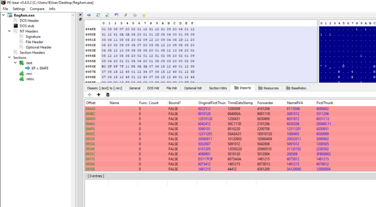PE-Bear에서 악성코드를 열고 Imports를 확인하면 잘못설정을 알리는 빨간색 줄이 보입니다.