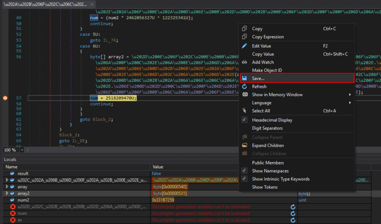 57번째 줄에 breakpoint를 설정하고 실행합니다. 그리고 Locals창에서 array2변수 오른쪽 버튼을 클릭해서 array2데이터를 파일로 저장합니다.