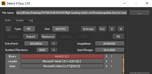 Detect It Easy도구로 파일 시그니처를 확인하면 AutoIt으로 확인됩니다. 즉, 악성코드는 Autoit스크립트가 컴파일된 실행파일입니다.