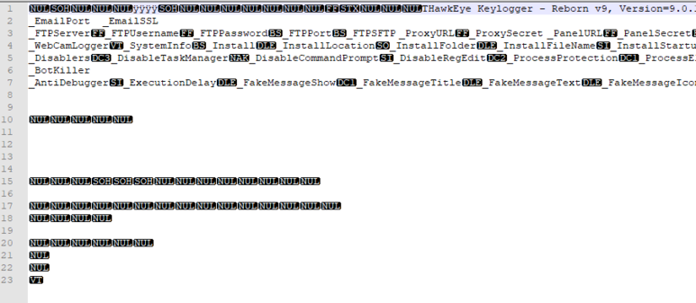 추출한 파일을 확인하면 호크아이 악성코드 패밀리 이름(Reborn)과 버전(9.0)등 여러 설정 정보가 있습니다.
