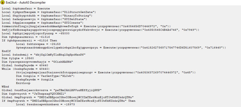 악성코드를 Autoit디컴파일 도구(Exe2Aut)로 실행하면 스크립트 원본을 얻을 수 있습니다. 스크립트는 심하게 난독화되어 있어 약 9000줄 이상입니다.