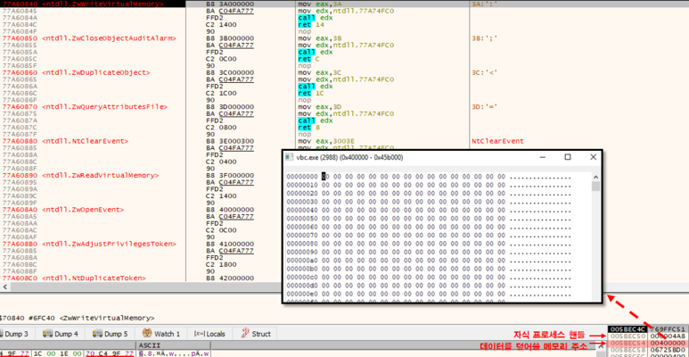 NtWriteVirtualMemory에 브레이크포인트를 설정하고 실행합니다. 스택창을 확인하면 vbc.exe의 0x00400000주소에 코드 인젝션을 수행하는 것을 알 수 있습니다.