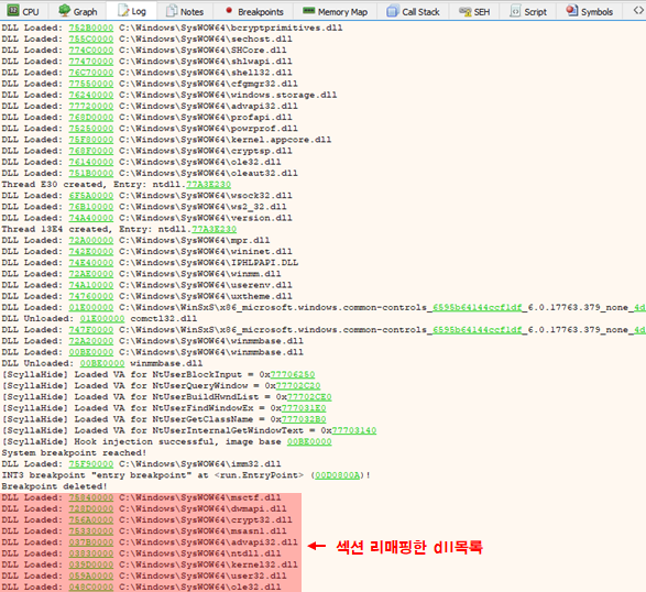 Log탭을 확인하면 제일 아래 화면에서 DLL Loaded메세지가 여러 줄 있습니다. 이 여러 줄이 3.1섹션에서 설명한 섹션 리매핑한 DLL목록입니다.