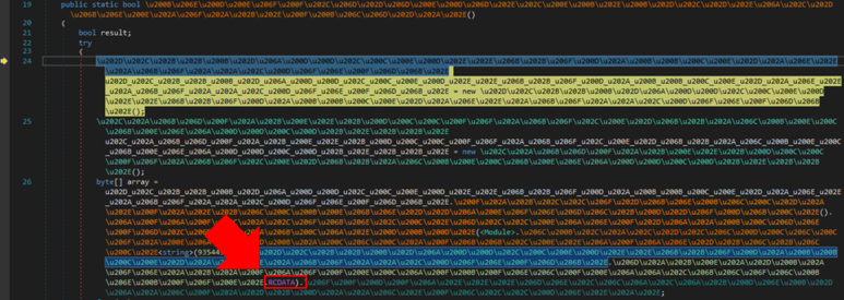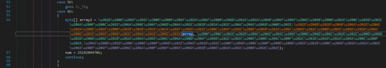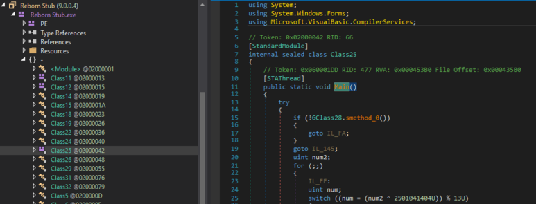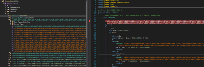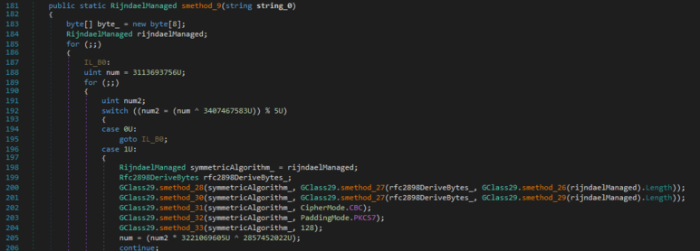 dnspy로 복원한 파일을 열면 클래스, 함수 이름 등이 보기 어렵도록 난독화되어 있습니다. 그리고 소스코드 분석을 최대한 어렵게 하기 위해 switch~case문을 사용해서 소스코드 실행흐름을 뒤죽바죽 섞었습니다.