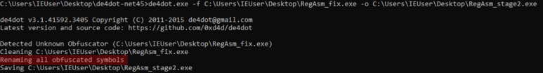 난독화 일부분을 보기 쉽게 바꿔보도록 하겠습니다. .NET 난독화를 자동으로 풀어주는 de4dot를 사용할 것입니다. -f인자에 복원한 파일경로를 입력하고 -o인자에 난독화가 해제된 결과를 저장할 파일경로를 적습니다.