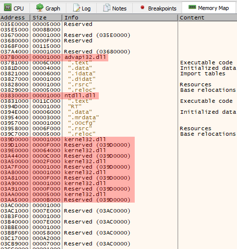 샌드박스와 백신 탐지를 회피하기 위해 프로세스 실행시 로드된 기존 dll을 사용하지 않습니다. 프로세스가 생성될 때 로드된 dll을 섹션을 사용해서 재로드합니다.