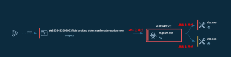 샌드박스가 최초로 실행한 booking.exe는 regasm.exe를 자식 프로세스로 실행합니다. regasm.exe는 윈도우에 존재하는 프로세스이지만 애니런 샌드박스는 HAWKEYE라고 탐지했습니다. 즉, 정상적인 regasm.exe프로세스에 악성코드를 인젝션한 것입니다.